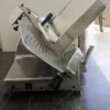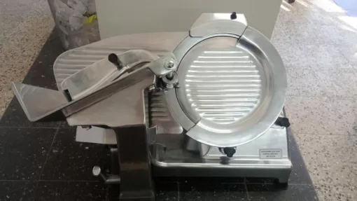 Cortadora de fiambre eléctrica diseñada para el corte de embutidos y alimentos con cuchilla de acero inoxidable.