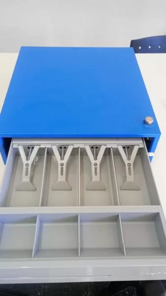 Gaveta para dinero con compartimentos para billetes, monedas, cheques y tickets.